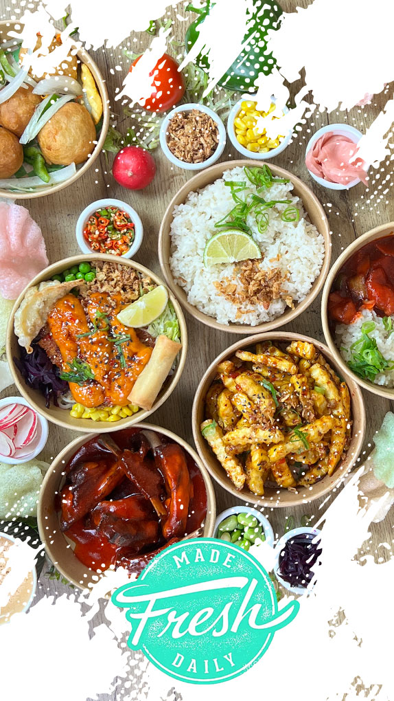 Served with Steam Rice, Variety of Mixed Leaves, Avocado, Radish, Cherry Tomato, Sweetcorn, Red cabbage